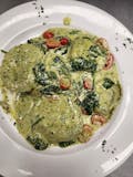 Jumbo cheese filled ravioli in a creamy pesto sauce with sauteed cherry tomatoes and spinach.