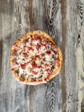 Pepperoni, meatball, mushrooms and black olives with mozzarella cheese and our homemade pizza sauce.